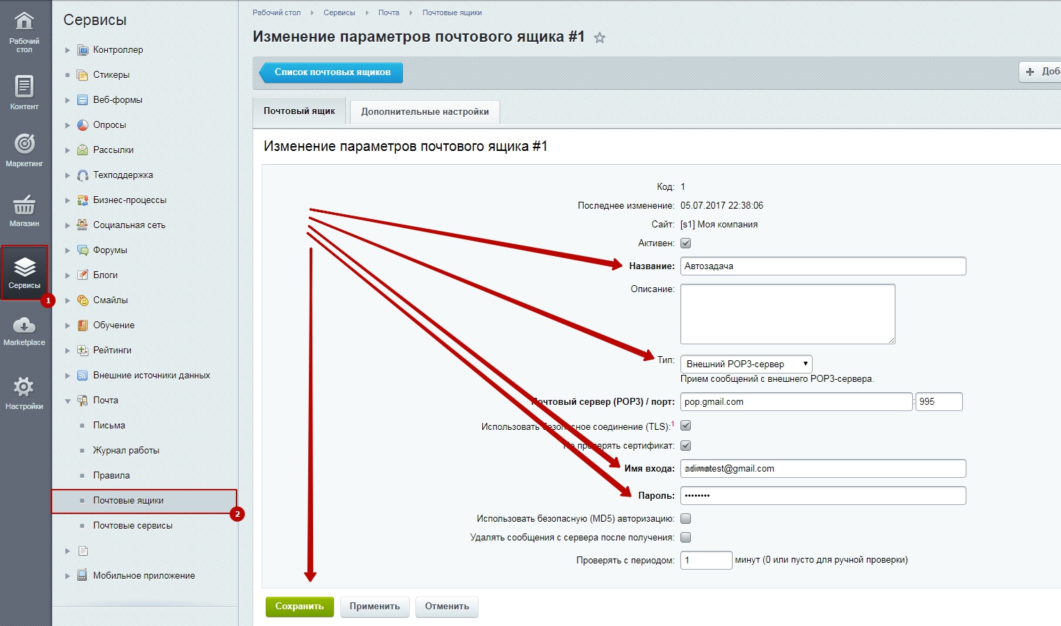 3. Данный служебный почтовый ящик нужно добавить в разделе Сервисы.