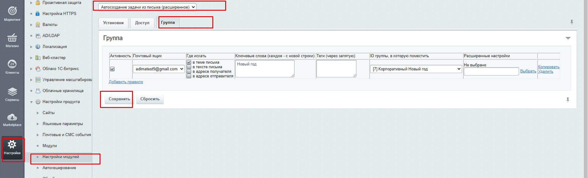 8. Чтобы создать правило прикрепления задачи к группе, переходим в администрирование > настройки > настройки модуля > Автосоздание задачи из письма (расширенное) > вкладка "Группа" > указываем ключевые слова, где их искать (в теме, тексте и пр), название группы, к которой необходимо прикрепить задачу. Ключевые слова содержатся в названии нужной нам группы.