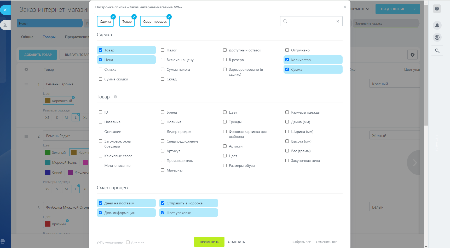 - Перейдите в настройки модуля и выберите смарт-процесс который будет использоваться. Перейдите в сделку/лид, переключитесь на вкладку "Товары", в настройках списках выберите новые поля для вывода в списке товаров.