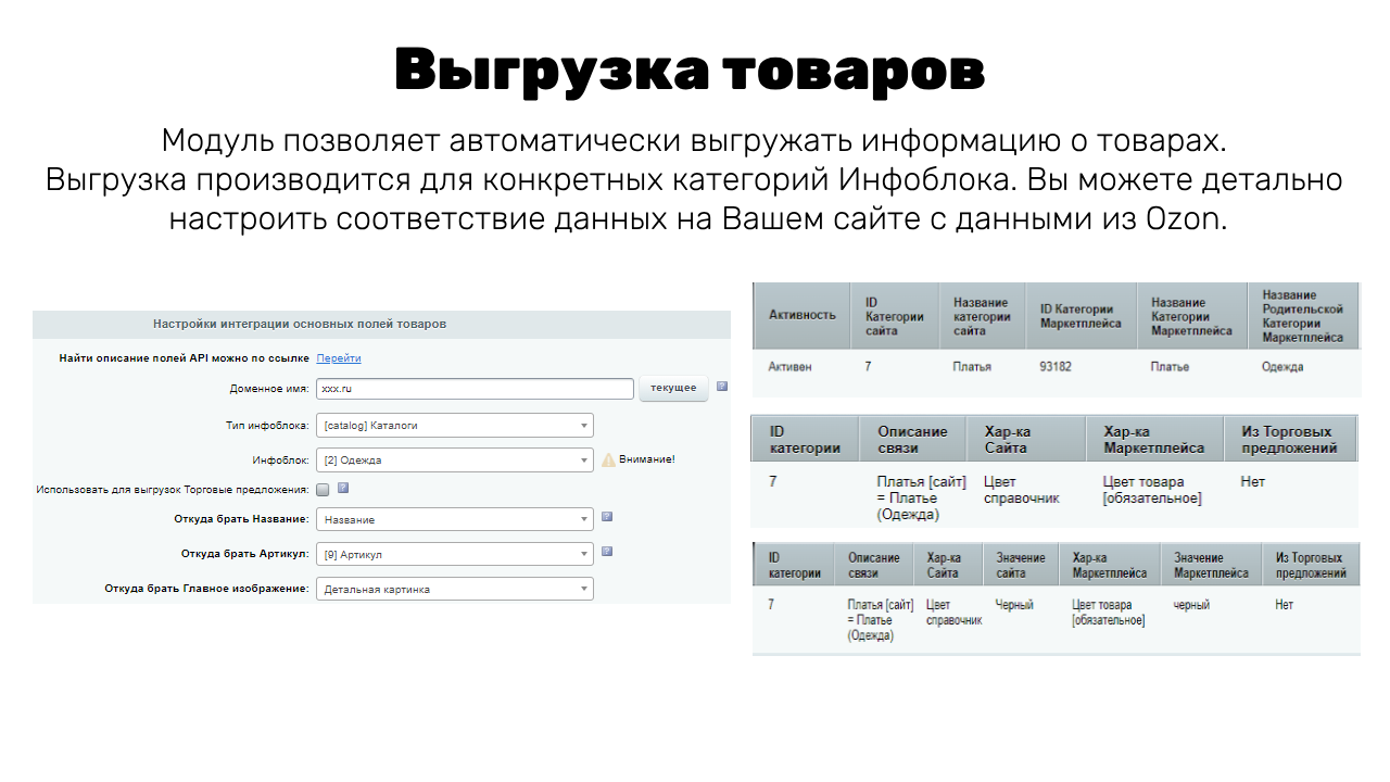 Алгоритм для базовой настройки экспорта товаров, цен, остатков:- В Основных настройках задать данные для подключения к API Ozon и настроить соответствие основных полей товаров