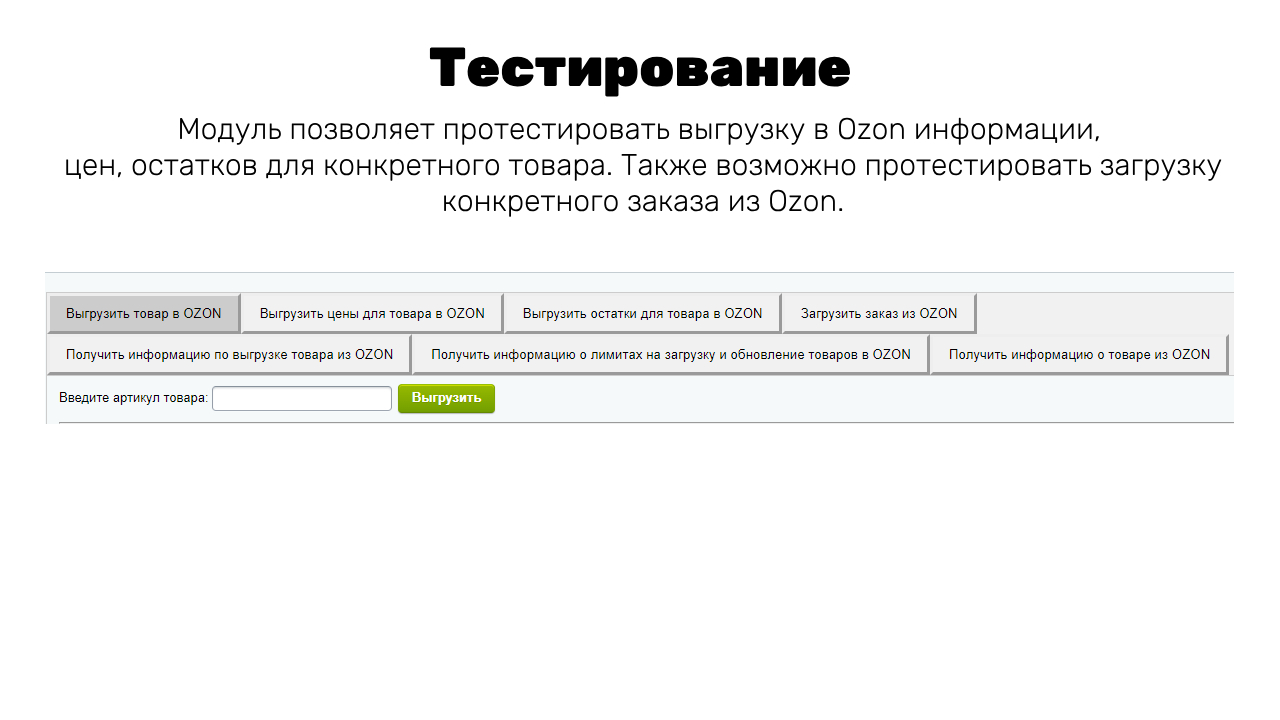 - В Тестировании выгрузки можете проверить корректность выгрузки товаров, цен, остатков