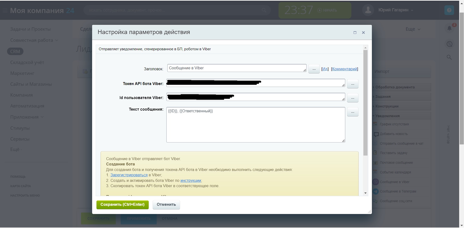 4. Скопировать полученный id пользователя Viber в соответствующее поле.