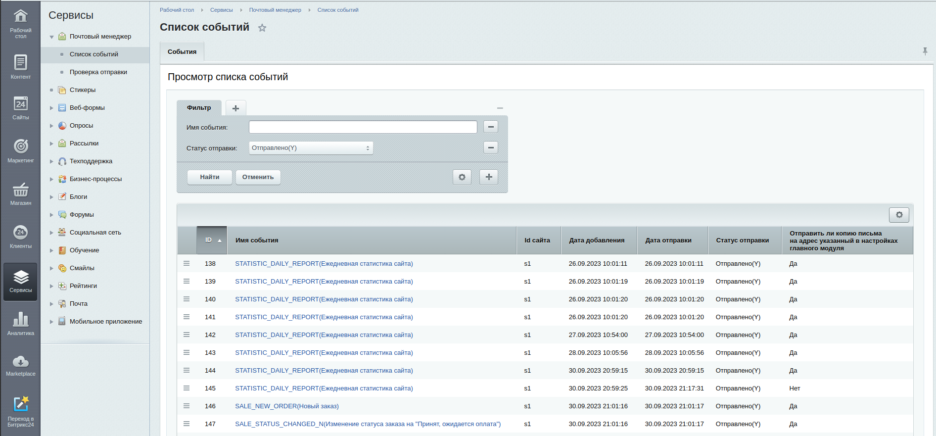 В данном пункте Вы можете увидеть все отправленные сообщения, хранящиеся в b_events таблице сайта. Можно осуществлять поиск, фильтрацию, переход на редактирование конкретного события.
