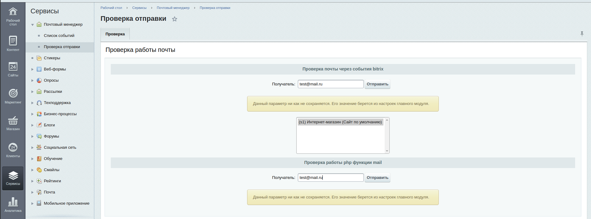Данный пункт позволяет проверить отправку писем как через функцию mail(), так и через bitrix. Для этого нажмите на кнопку "Отправить". Поле для проверочной почты заполняется автоматом из настроек главного модуля.