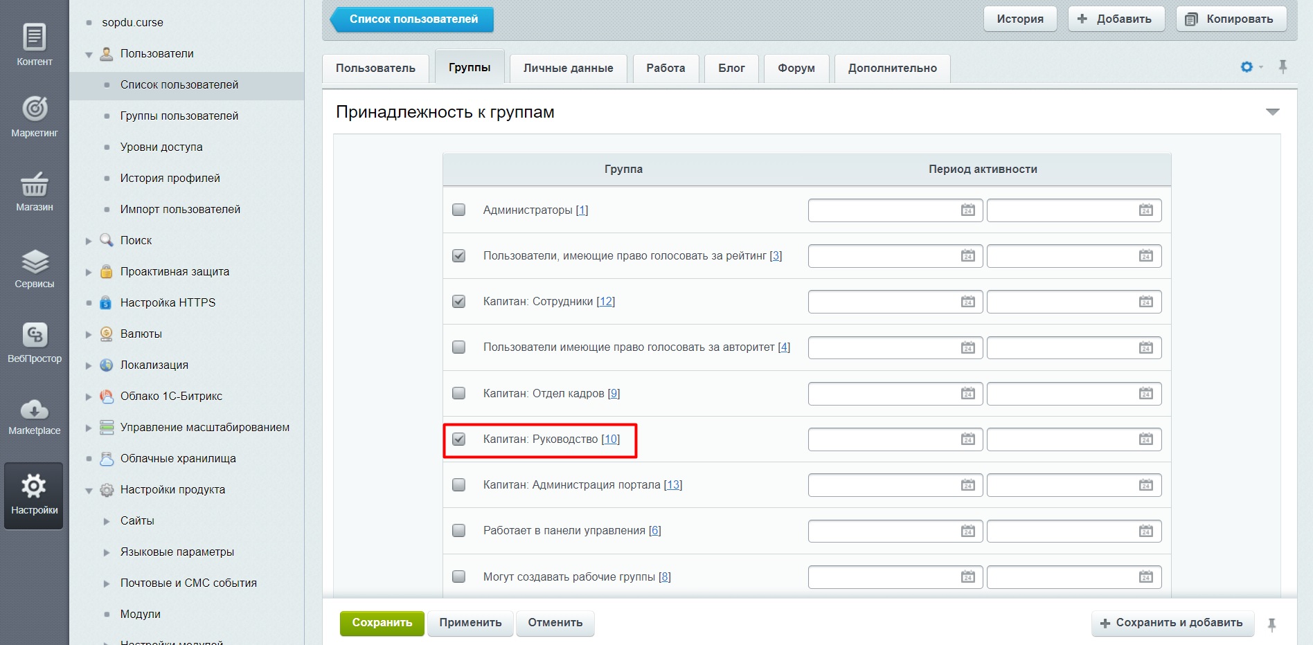 Для смены групп пользователей, которым доступен режим руководителя необходимо в настройках модуля на закладке "Настройки" выбрать нужные группы пользователей путем отметки в поле "Группы пользователей" и сохранить настройки по клику на кнопку "Сохранить".