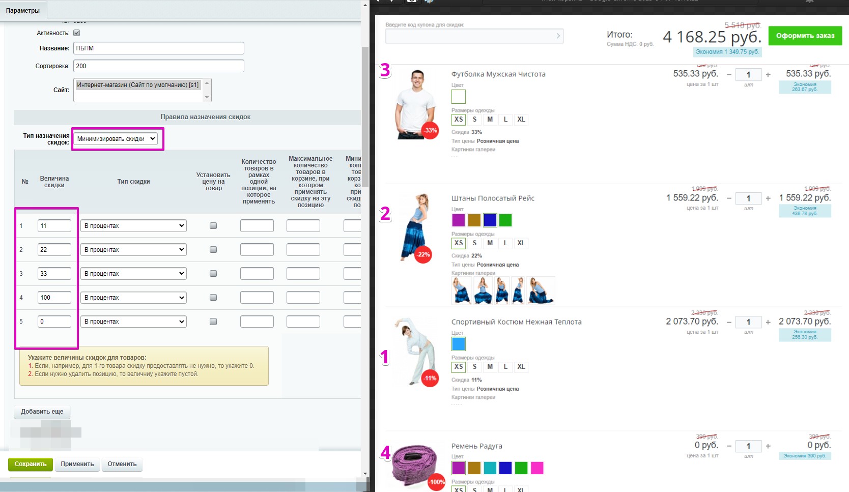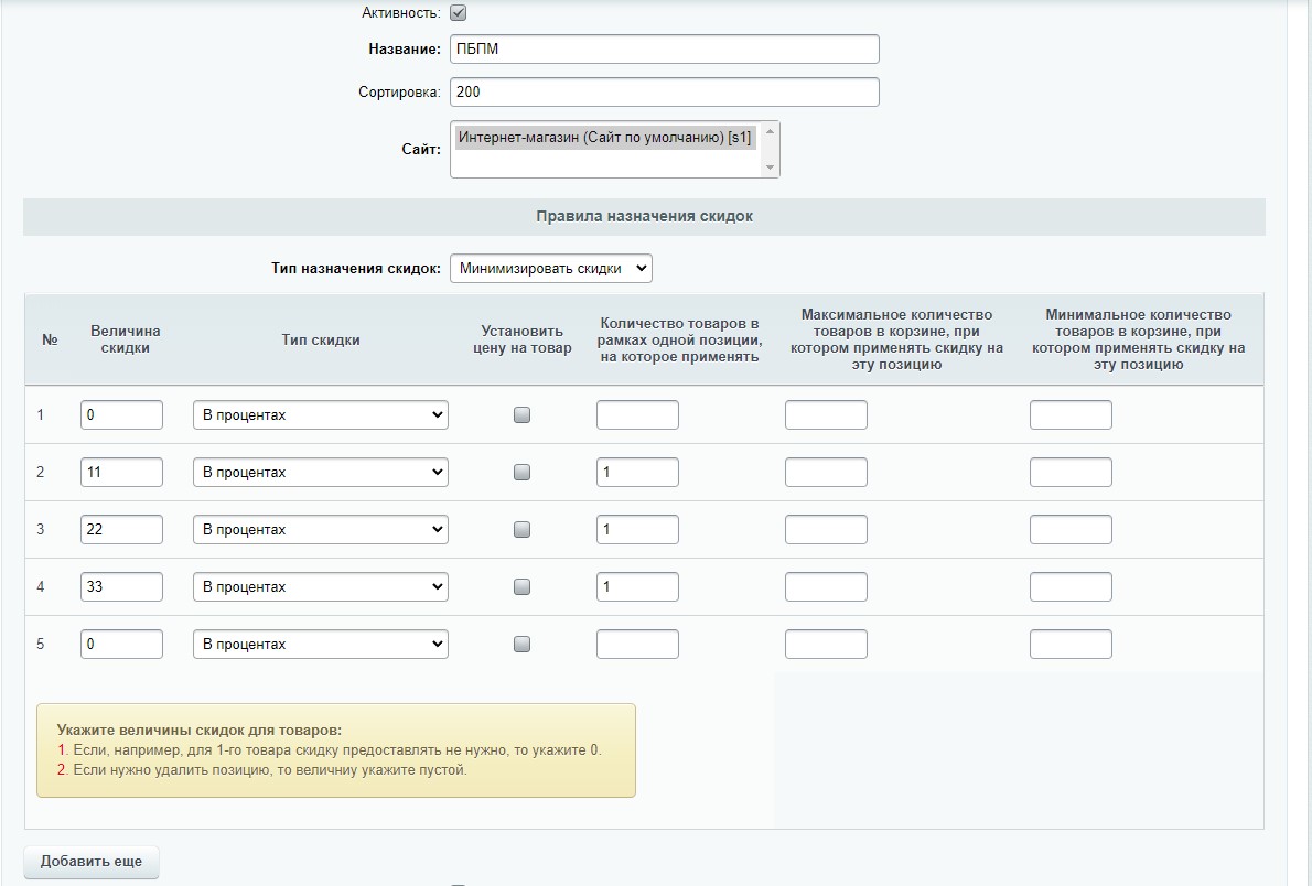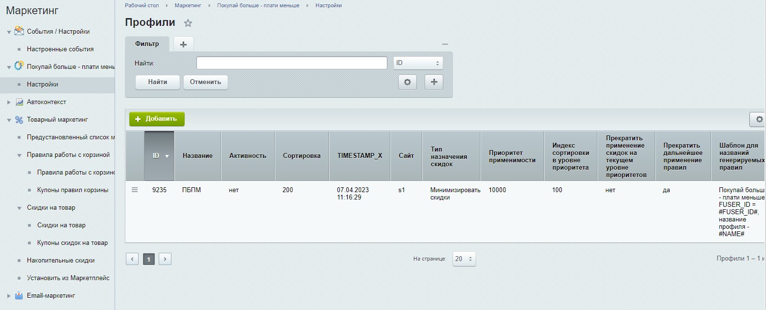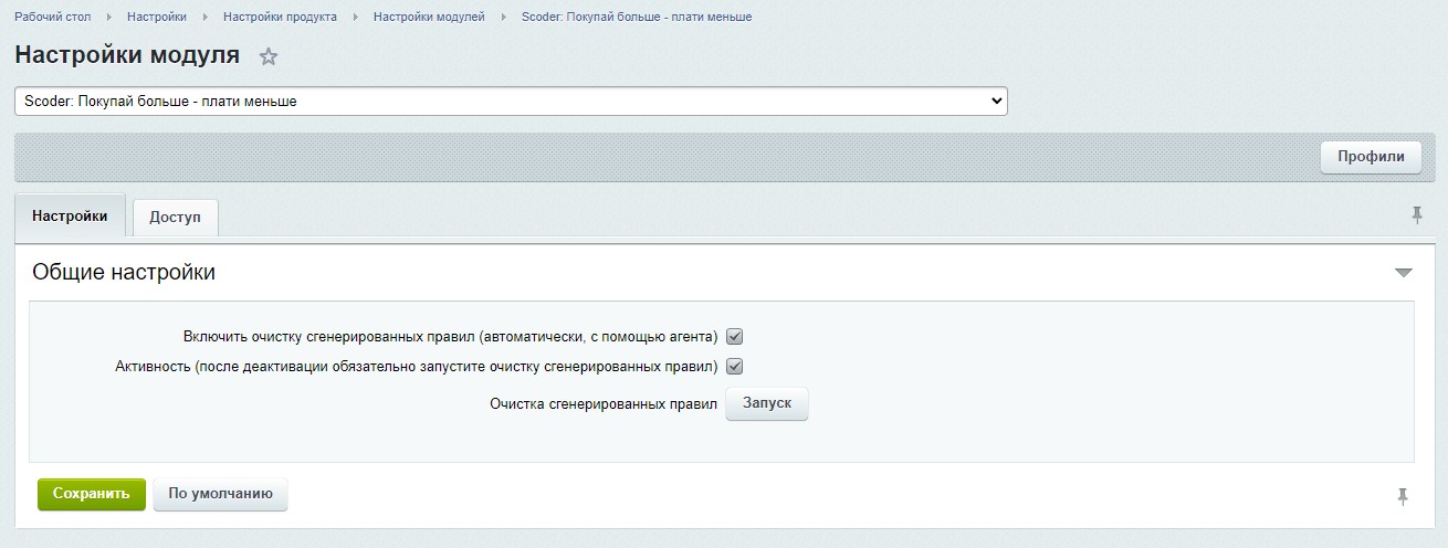 - После установки модуля необходимо его настроить, для этого перейти на страницу в административном меню: [U]Маркетинг[/U] -> [U]Покупай больше - плати меньше[/U] -> [U]Настройки[/U].