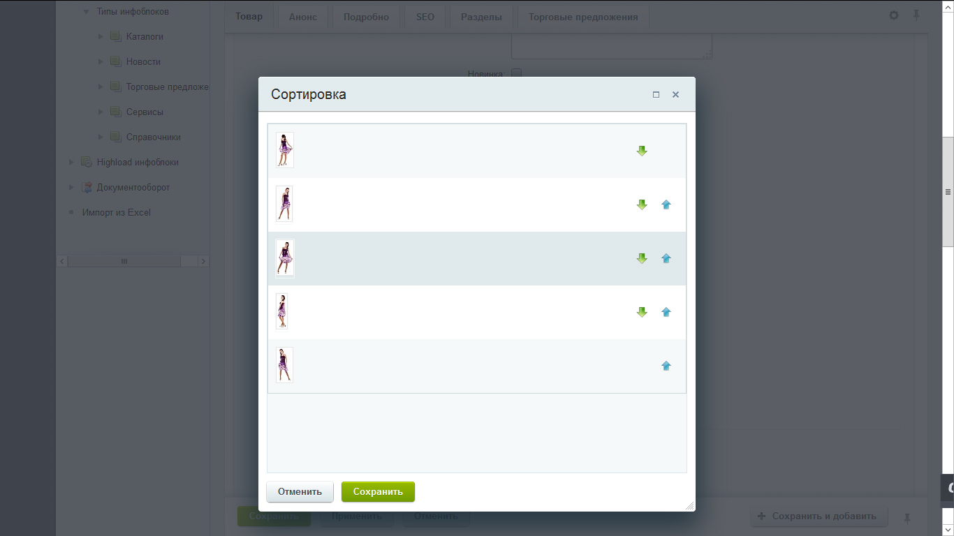 Внимание! Кнопка сортировки появляется только после создания самого элемента инфоблока и после заполнения не менее 2-х значений множественного свойства.