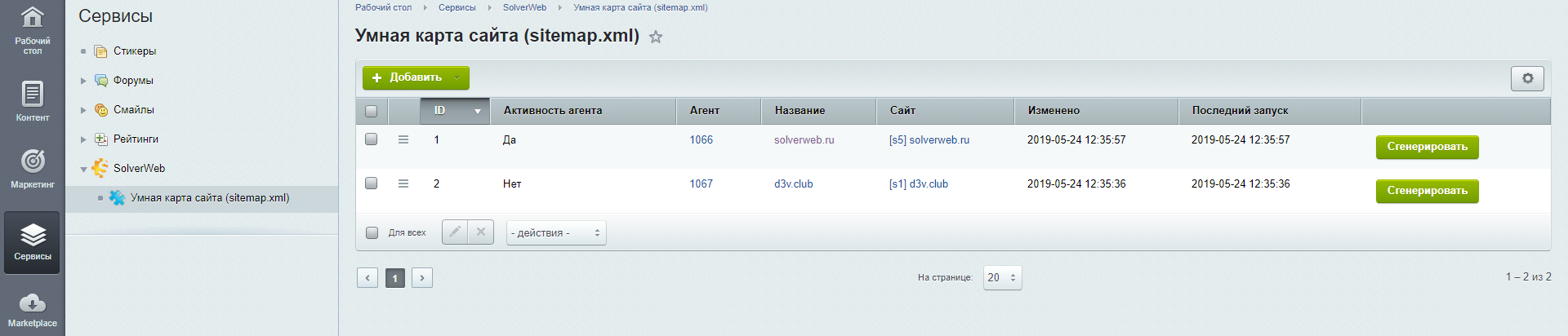 После установки модуля необходимо перейти в категорию "Сервисы" -> "SolverWeb" -> "Умная карта сайта (sitemap.xml)", выбрать необходимые инфоблоки, статичные страницы и задать им параметры для выгрузки.