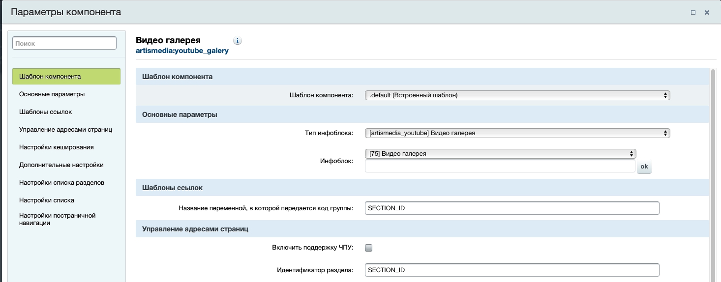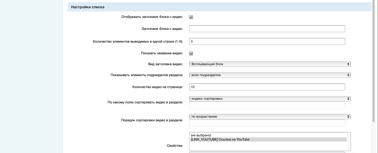 Необходимо установить модуль из Marketplace. Добавляются 3 новых компонента (Видео галерея (комплексный), Элементы раздела видео галереи, Структура разделов видео галереи. Создается новый информационный блок "Видео галерея" с демо-элементами. Для работы в настройках компонента необходимо выбрать свойство: https://prnt.sc/11vgj5q.