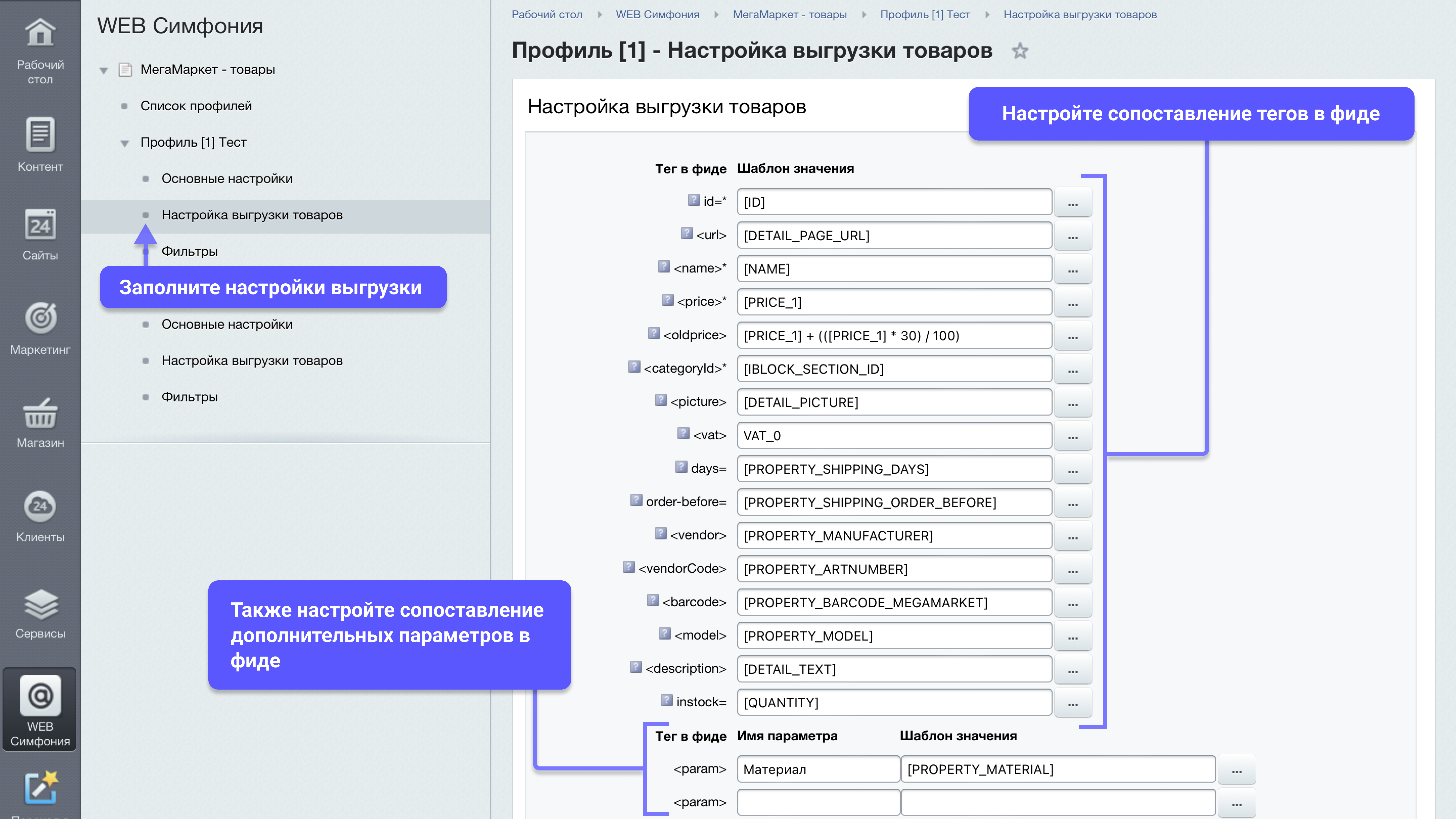 Вы можете установить и настроить модуль с помощью подробной пошаговой инструкции.После установки модуля, перейдите в следующий раздел в административной панели Битрикс: "WEB Симфония" -> "МегаМаркет - товары" -> "Список профилей". Создайте профиль и заполните настройки по вашим индивидуальным параметрам в следующих подразделах профиля: - Основные настройки - Настройка выгрузки товаров - Фильтры После того как вы создадите выгрузку, скопируйте ссылку на нее и вставьте ее в личном кабинете МегаМаркет.